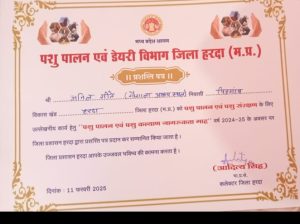गत दिवस स्थानीय कृषि उपज मंडी प्रांगण में पशु पालन और पशु संरक्षण को लेकर पशुपालन विभाग जिला हरदा द्वारा विशाल संगोष्ठी का आयोजन किया गया। संगोष्ठी में इस कार्य से जुड़ी संस्थाओं के प्रतिनिधि शामिल हुए। कार्यक्रम में जिला प्रशासन और विभाग द्वारा इस क्षेत्र में उल्लेखनीय कार्य करने वाली संस्थाओं और व्यक्तियों को प्रशस्त पत्र भेंटकर सम्मानित किया गया। जानकारी के अनुसार जिला कलेक्टर आदित्य सिंह ने पिड़गांव (हरदा) की गौशाला “गौशाला आश्रय स्थल” के संचालक अनिल गीते को प्रशस्तिपत्र भेंटकर सम्मानित किया।